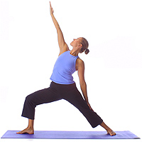 Place the feet wide apart turn the right toes forward and the left toes at a 45-angle, push evenly down through all four corners of the feet. Bend the right knee and keep the back leg straight. Tuck the tailbone under, pull the navel towards the spine and lift the pelvic floor muscles. Place the left hand down and inhale, lift the right up, look up. Spiral the chest towards the sky. Repeat on the other side. Maintain this posture for 5 to 10 deep breaths.